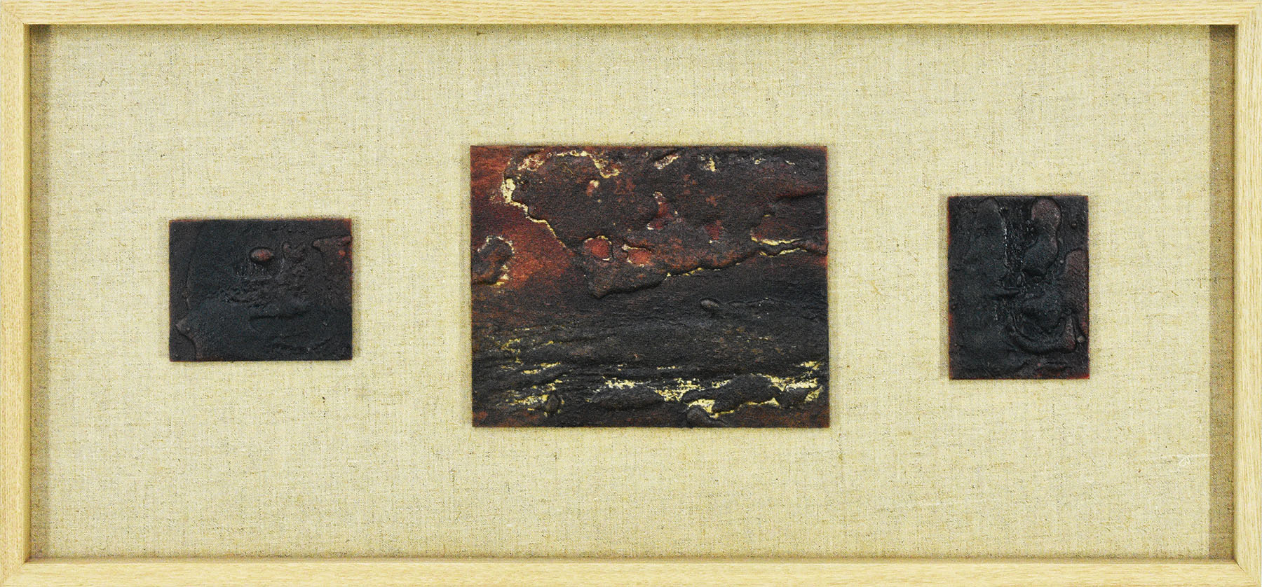 油彩 板 3点組 裏板にサイン、タイトル、年記 M画廊シール F:28.9×62.1 額装