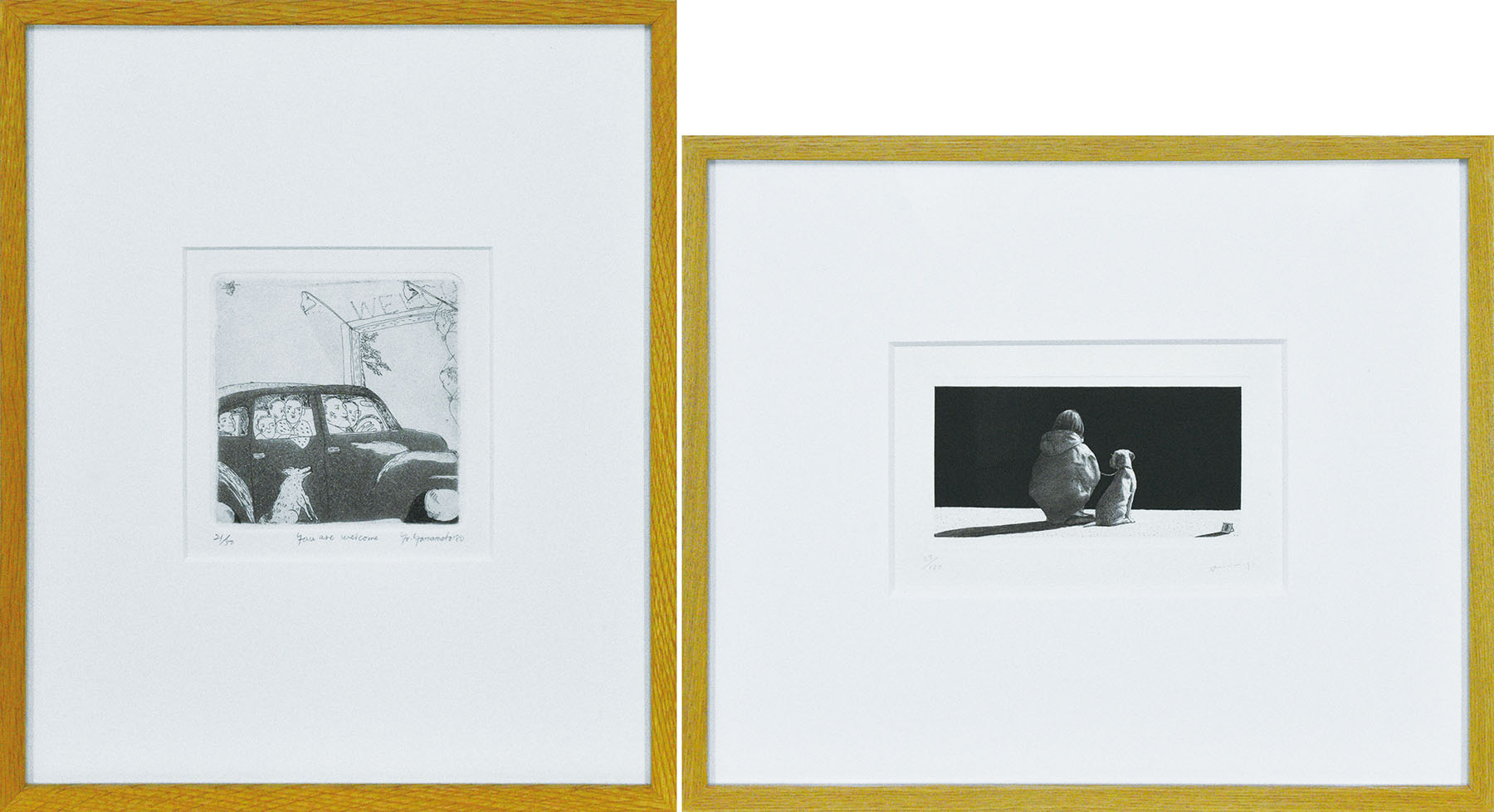 | 解説 | 山本容子「You are welcome」 銅版画 限50 サイン、タイトル、年記 Galleria Grafica Tokioシール 9.5×9.5 F:31.2×26 額装 1980 尾崎ユタカ「少女と子犬」 銅版画 限120 サイン Galleria Grafica Tokioシール 6×12 F:26×31.2 額装 2001 |