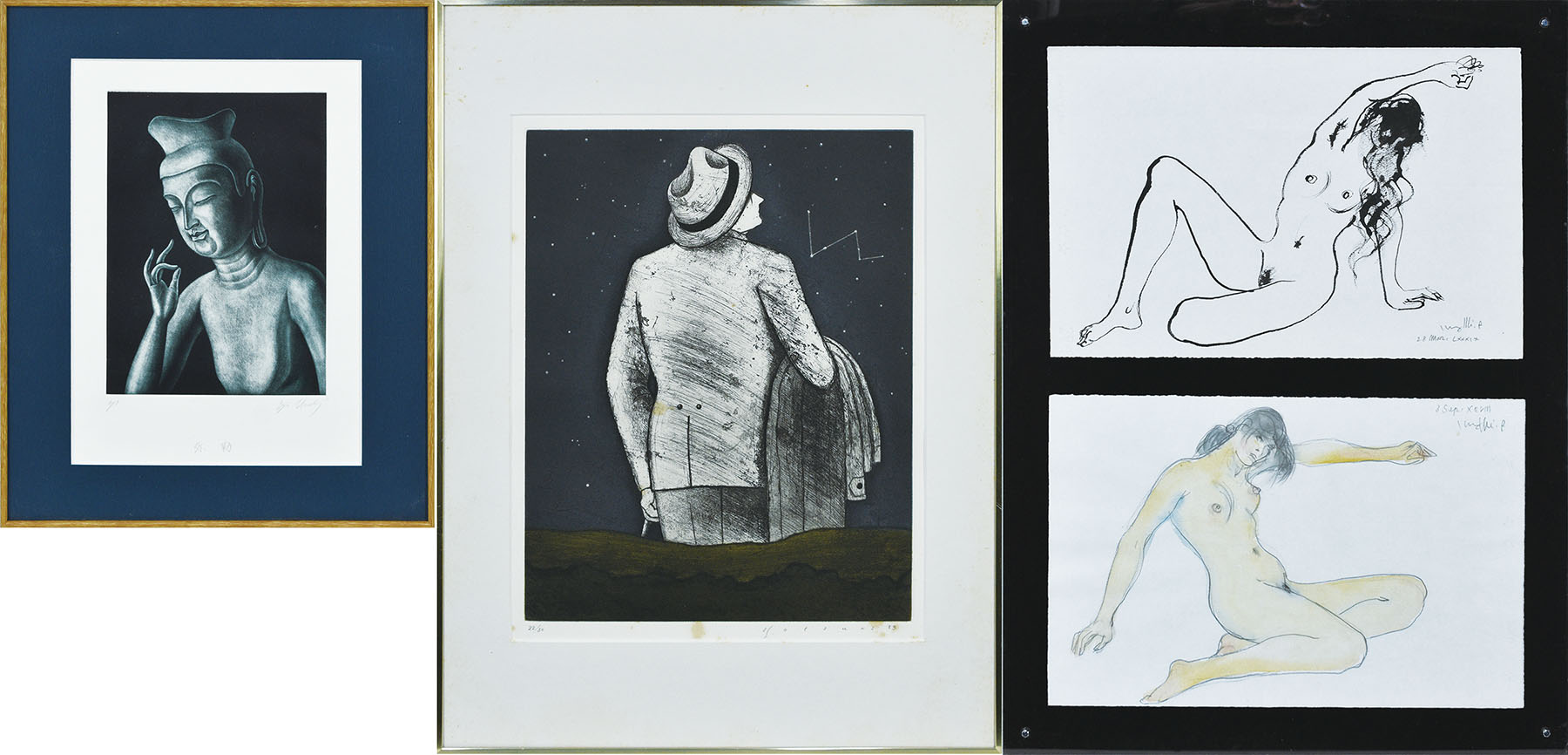 | 解説 | 古沢岩美「作品一括」 直筆画2枚 各サイン 合装 各33×50 F:80×60 額装 梅木英治「弥勒」 銅版画 AP版 サイン、タイトル 24.5×17.8 F:42.7×35.2 額装 大月雄二郎「作品」 銅版画 限50 サイン、年記 29.8×31.3 F:61×45.8 1983 額装 シミ |