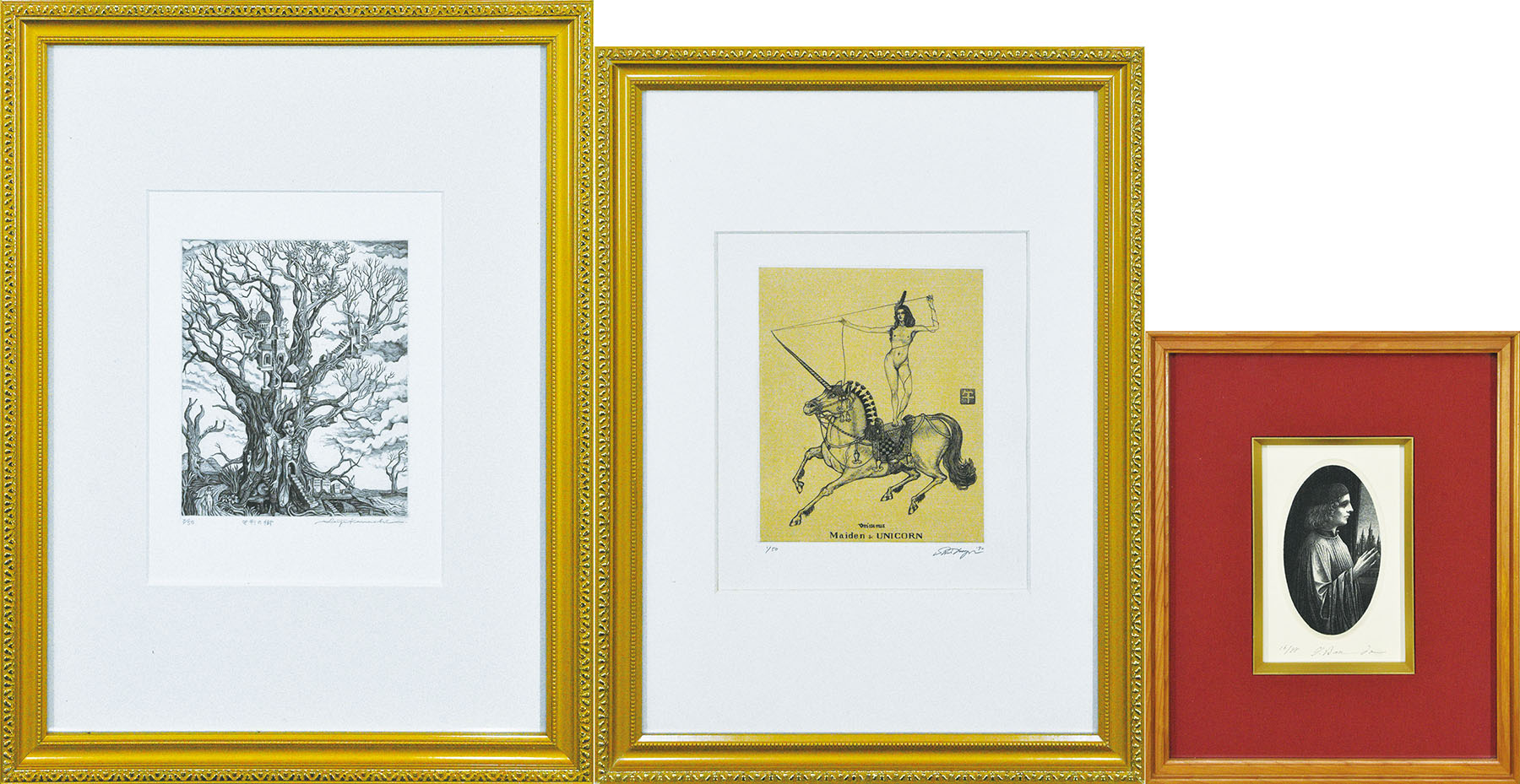 | 解説 | 蒲地清爾「苦刑の樹」 銅版画 限50 サイン 17.7×14.5 F:50.2×38 額装 多賀新「Maiden & Unicorn」 銅版画 限50 サイン、年記 17.5×14.5 F:47.2×35.2 額装 1990 坂東壮一「作品」 銅版画 限88 サイン 11×6.5 F:29×24 額装 |