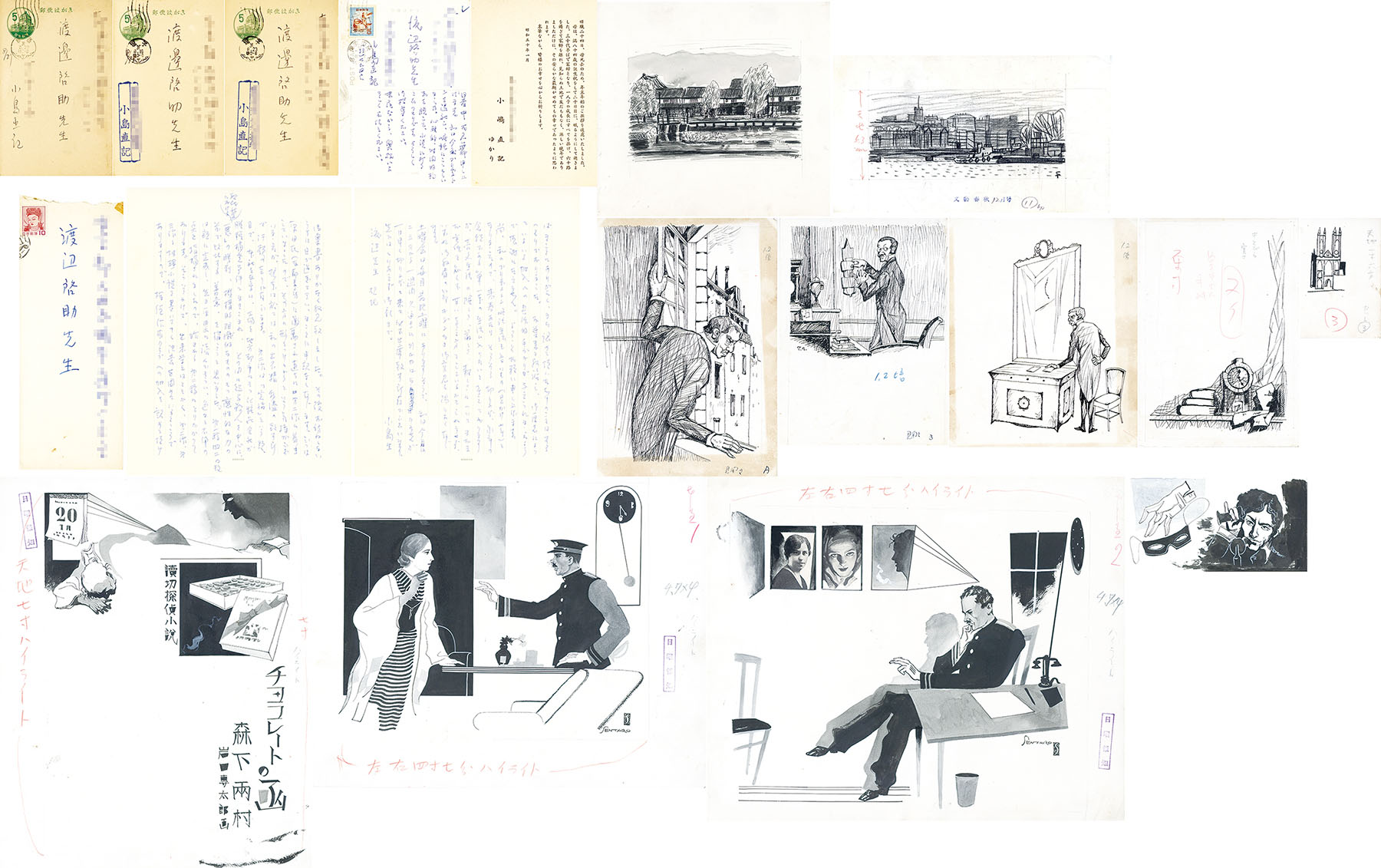 | 解説 | 小島直記「葉書・書簡」 渡辺啓助宛 葉書5枚 書簡1通(封筒付) 石川滋彦「作品」 直筆原稿2枚 各サイン 13.5×23.7、19×20 中谷泰「作品」 直筆画稿5枚 1枚にサイン 約10×7~22.5×15.5 岩田専太郎「チョコレートの函」 直筆画稿 3枚にサイン |