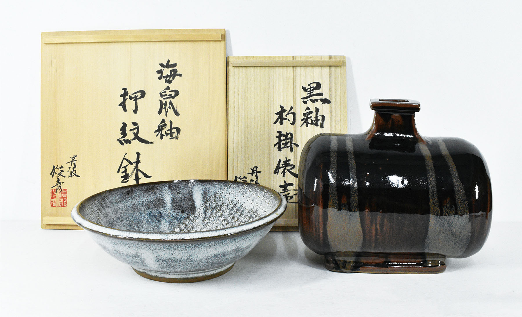 「海鼠釉 押紋鉢」 陶器 共箱 30×30×8.5