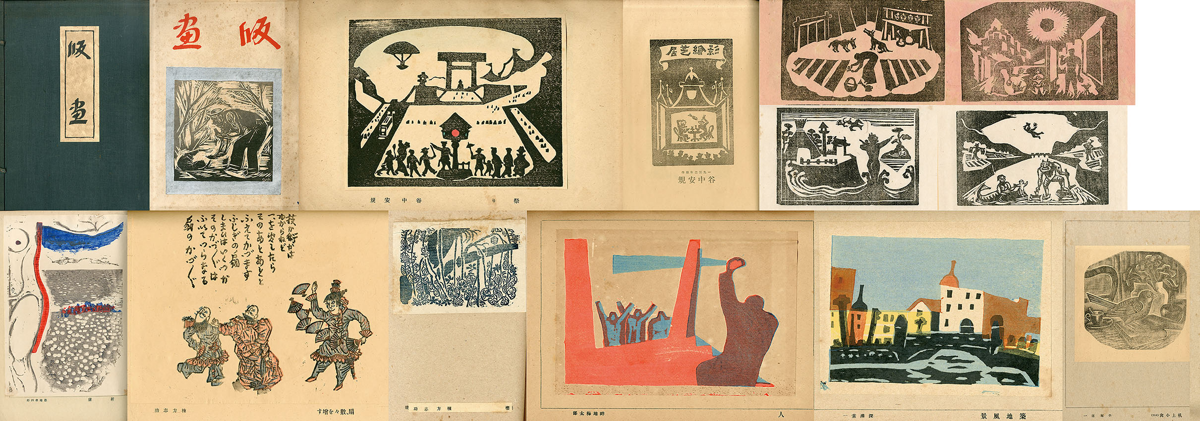 白と黒社 限300 帙 版画雑誌「版芸術」の版画・本文の抜粋を合本して出版したもの。谷中安規(1枚と「影絵芝居」全13図)・恩地孝四郎・平塚運一(5枚)・棟方志功(2枚)・前川千帆(2枚)・畦地梅太郎・深沢索一・川上澄生の手摺木版及び機会刷木版約100図