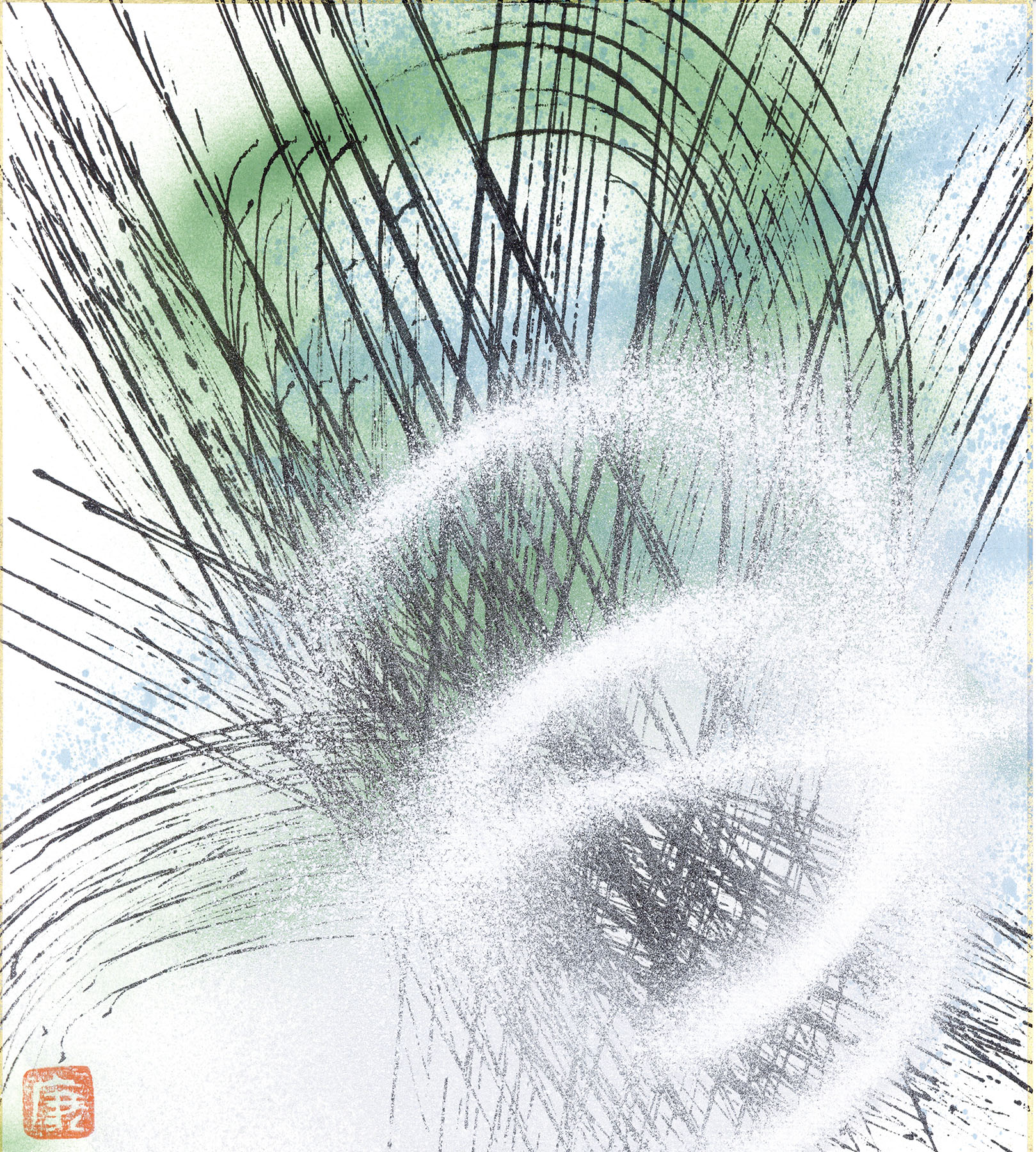ミクストメディア 色紙 印 裏にサイン、タイトル 27×24