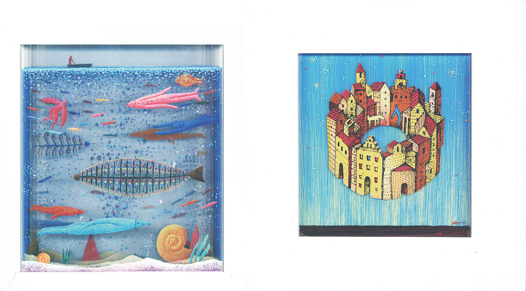 「空中夢 街」 ガラス絵 サイン Mizuho Oshiro Galleryシール 27.4×26.5 1999
